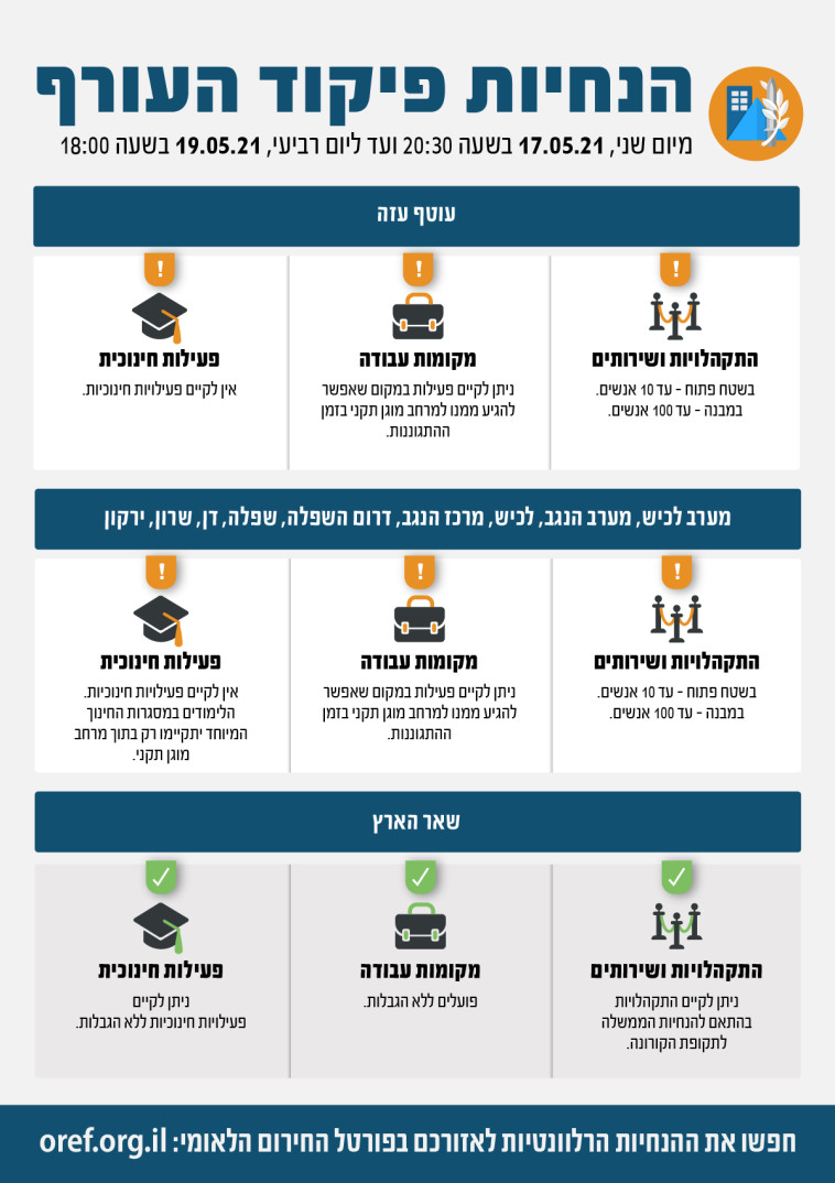 הנחיות לנכנסים וליוצאים ממדינת ישראל באתר משרד הבריאות >. Make social videos in an instant: Use custom templates to tell the right story for your business. בשלב זה גורמים מקצועיים בודקים באם מדובר בתקלה נקודתית של מספר צופרים או בתקלה כללית. Последние твиты от פיקוד העורף (@pikudhaoref1). הפיקוד עושה זאת על ידי הכנת המרחב האזרחי טרם עימות, תמיכה במרחב האזרחי בעת עימות תוך ביצוע פעולות חילוץ והצלה באירועי תקיפת העורף. לאורך כל סוף השבוע והחג: האפליקציה הרשמית של פיקוד העורף להתרעה, הנחיה והסברה לעדכונים בזמן אמת בשגרה ובחירום. אין לימודים בגוש דן ובשרון. הבדיקה והתיקונים ייארכו מספר שעות. מערכות ההתרעה של פיקוד העורף סלקטיביות ומפעילות את האזעקה רק באזור בו קיימת סכנה לאוכלוסייה. הפארקים הציבוריים נסגרים בהתאם להנחיות פיקוד העורף האוסרת על התקהלות בשטח פתוח (עד 10 אנשים). התגיות והקישורים מועלים עי הגולשים , אם מצאתם תוכן בלתי הולם , צרו איתנו קשר לבירור הנושא.